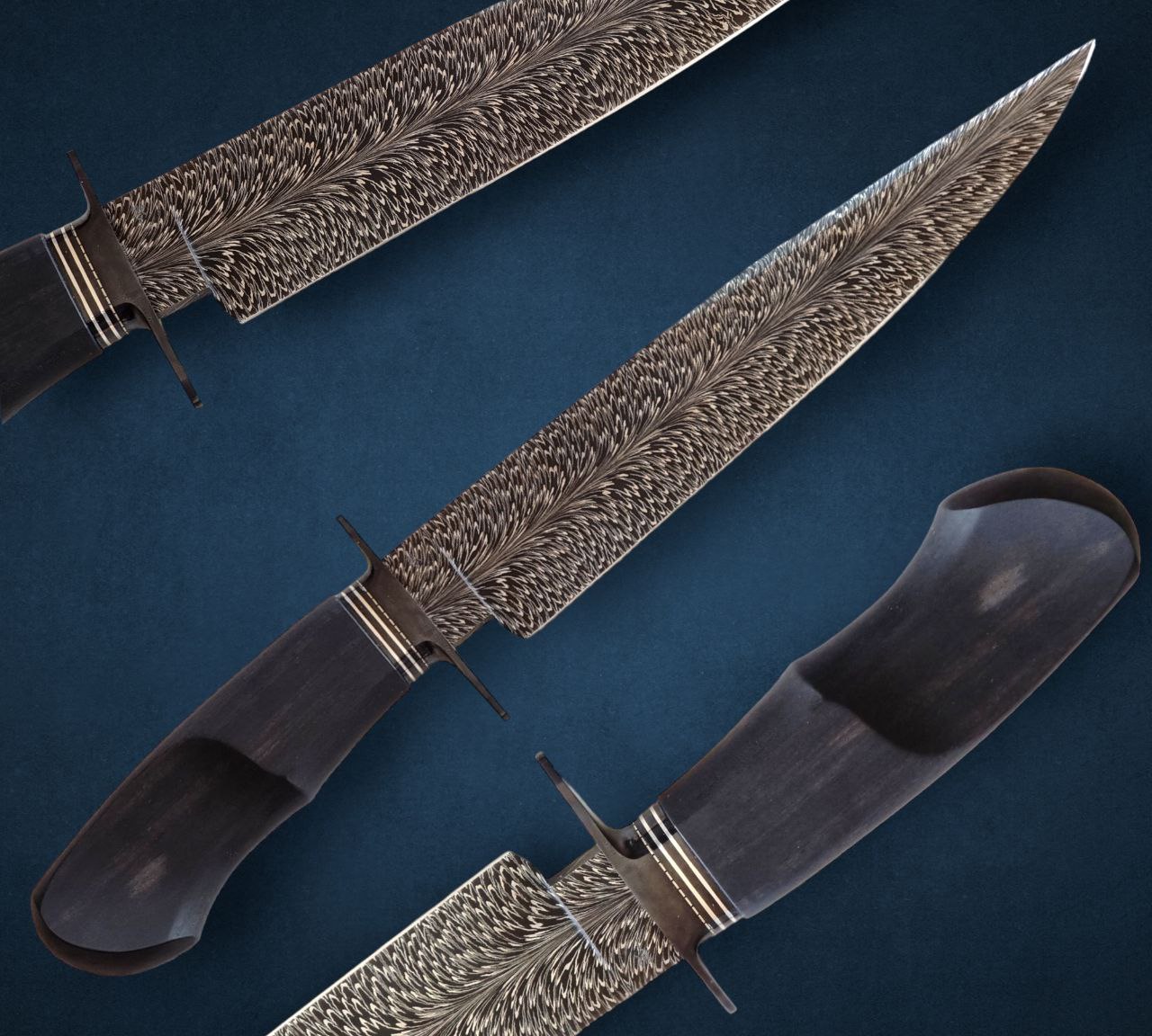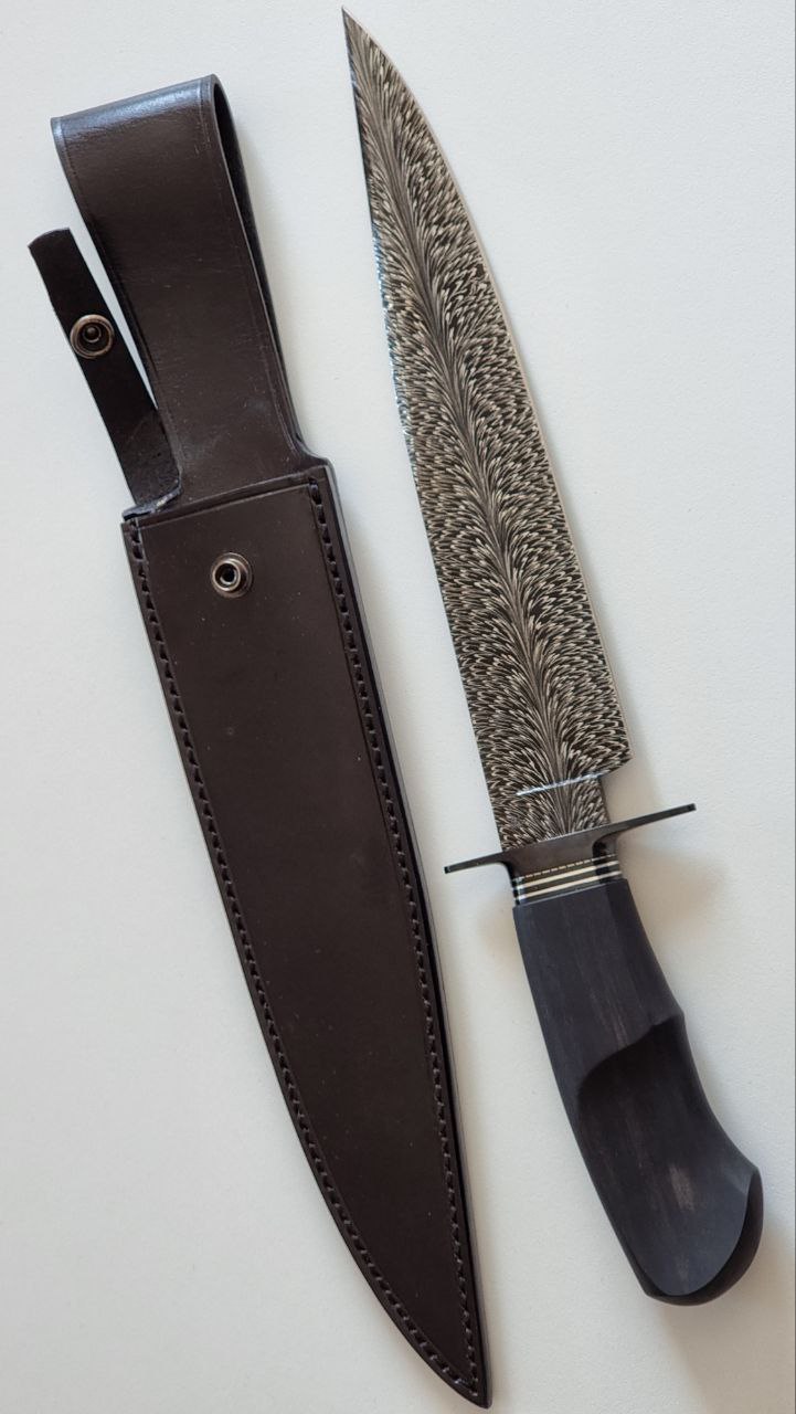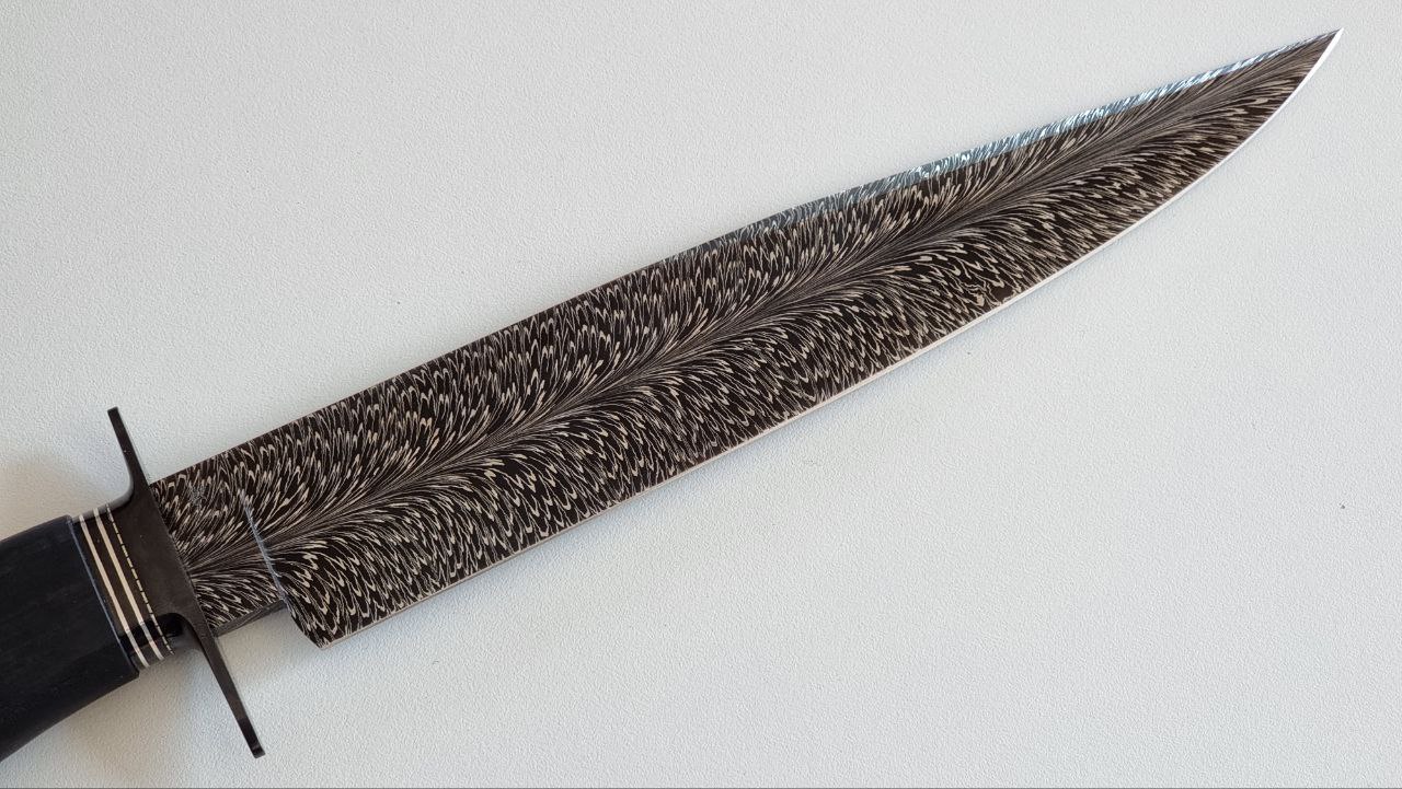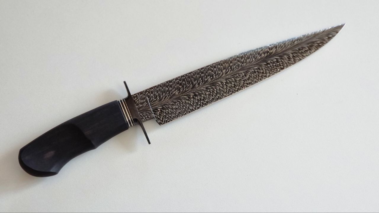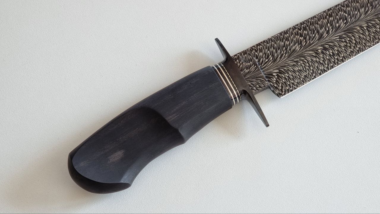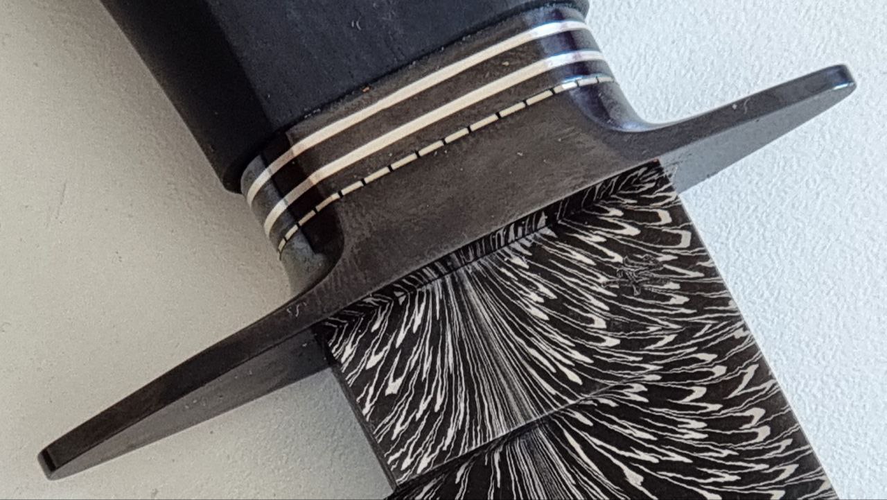 Damasco pluma de acero 1070 y 15n20, 5.7mm de espesor, 230mm de largo de hoja, 125mm de cabo. 355mm largo total cabo de ebano de Gabón, guarda acero 1045 pavonado, collarín con Inlay de Plata, y separador de alpaca